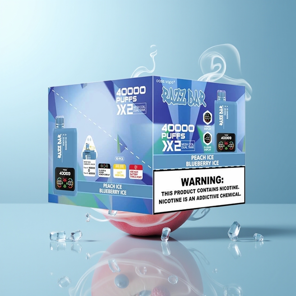 Schweiz Großhandel Razz Bar 40000 Züge Pfirsich Eis – Heidelbeer Eis Leistungsbildschirm 1.0Ohm 2 Mesh Coil 650 Mah Typ-C Anschluss 2% 5% Nikotin