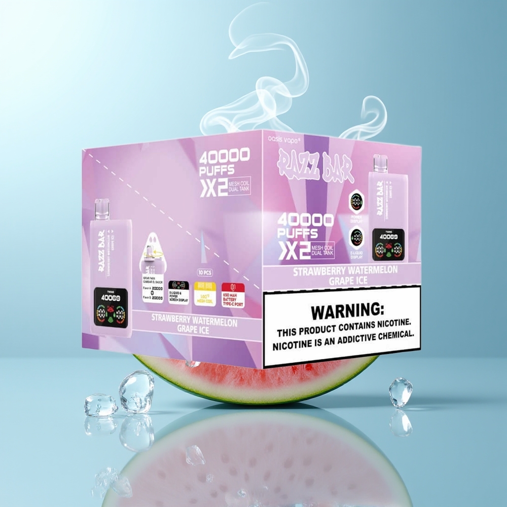 Schweiz Großhandel Razz Bar 40000 Züge Erdbeer Wassermelone – Traube Eis Power Bildschirmanzeige 1.0Ohm 2 Mesh Coil 650 Mah Batterie Typ-C Port 2%,5% Nikotin